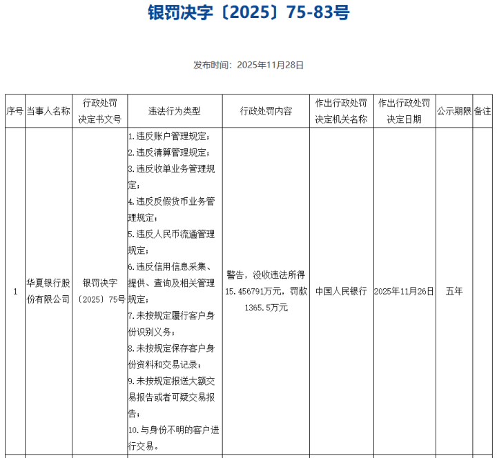 对此,中国人民银行对华夏银行警告,没收违法所得15.456791万元,罚款1365.5万元。