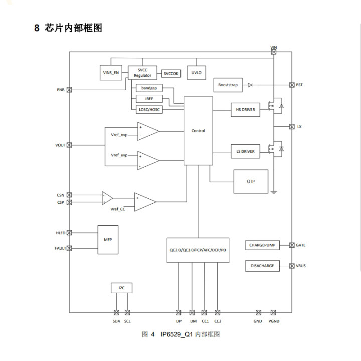 IP6529_Q1采用同步开关降压架构,内置功率MOS管,可减少外部元件数量,简化电路设计。其QFN24(4mm×4mm)封装体积较小,有助于节省PCB空间。同时,较高集成度设计有助于降低BOM成本。此外,芯片支持I²C接口,可与外部MCU通信,实现电压、电流、PDO等参数的读取与配置,为充电管理提供便利。