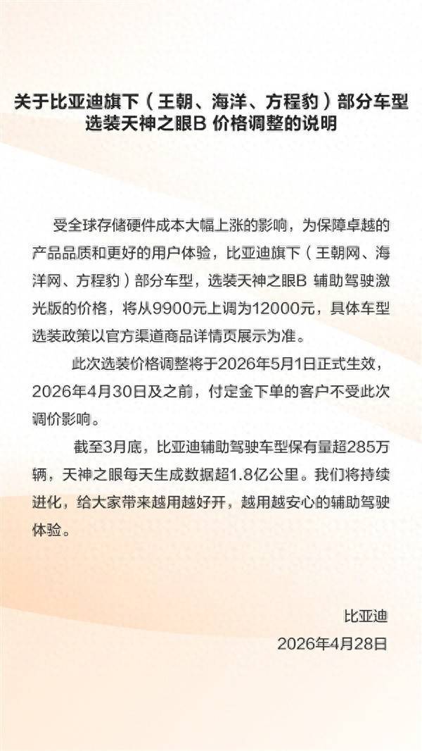 4月28日,比亚迪汽车正式发布价格调整说明,旗下王朝网、海洋网、方程豹部分车型,选装天神之眼B辅助驾驶激光版的费用将上调2100元在线股市配资平台,此次调价因全球存储硬件成本大幅上涨导致,将于5月1日正式生效,4月30日前付定金下单的客户可不受影响。